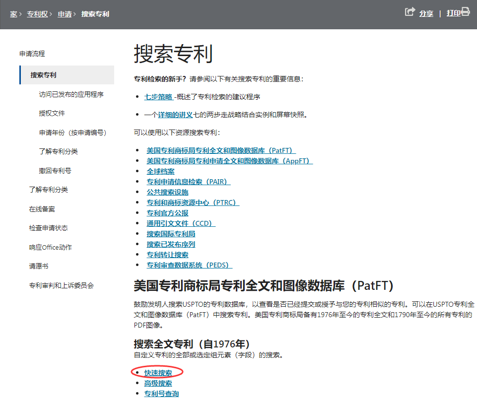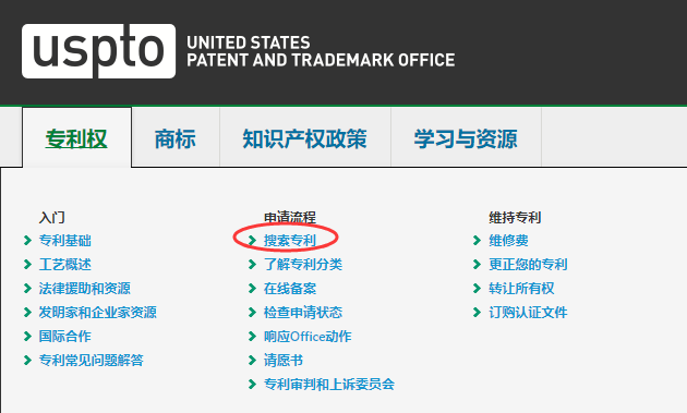 ① 进入美国商标专利官网后,点击“专利权”,选择“搜索专利”