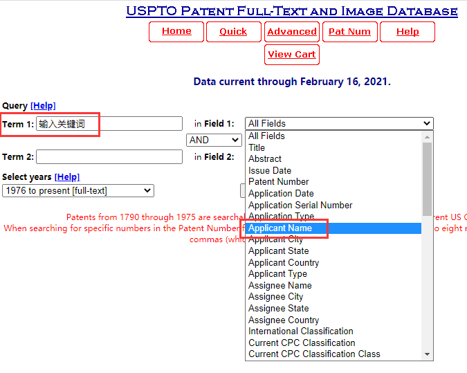 ③ 在“Term 1”线框内输入关键词,在“in Field 1”线框内选择关键词对应的条件,比如专利申请人名称,不清楚的话也可以不选择,然后点击“search”进入查询结果页面